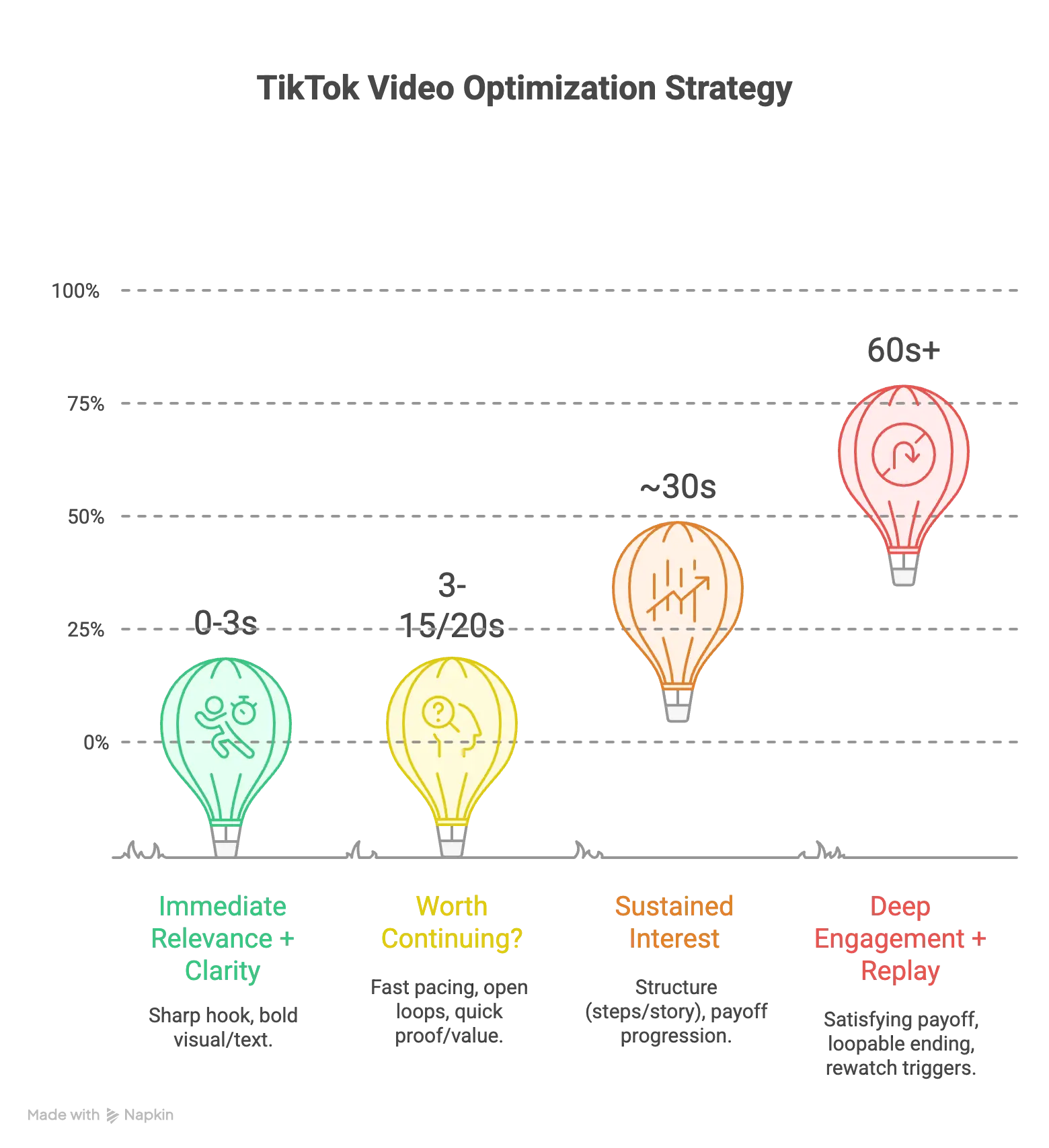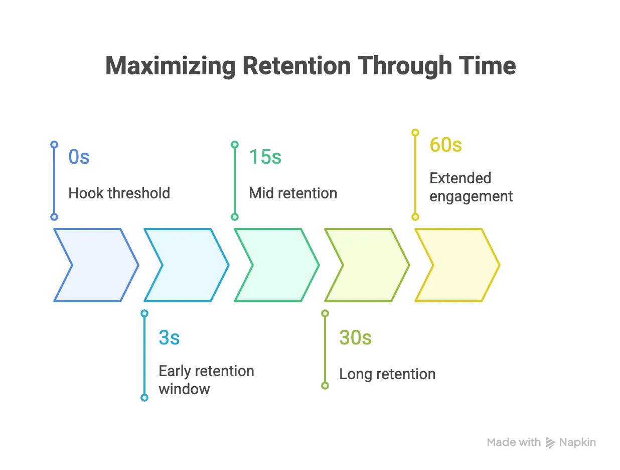 But 2025 success is entry ticket + retention checkpoints. You’re not just trying to stop the scroll. You’re trying to keep earning attention at 15–20 seconds, push toward completion, and trigger saves, shares, and rewatches.